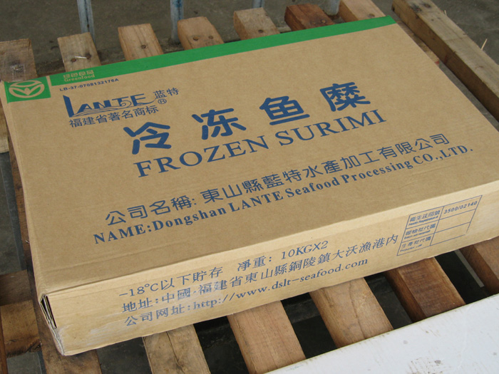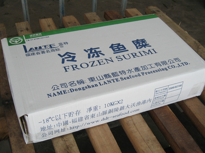 “蓝特”牌冷冻鱼糜采用天然优质的海洋底层鱼类为原料,引进先进的生产设备和工艺技术精制而成,它具有蛋白质含量高,色泽白,夹杂物少,凝胶强度好,组织细腻,耐贮藏,易流通加工等特点,是制造鱼糜制品如鱼丸、虾丸、鱼糕、鱼香肠、蟹柳等产品的理想原料,是一种无污染的生产海鲜食品的优质原料。